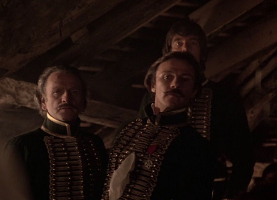 As for why Feraud and d’Hubert are obsessed with each other, I mean — they’re not. There’s no passion, no subversive friendship. Feraud sees d’Hubert as the embodiment of his current grievances. D’Hubert, for his part, isn’t wired for obsession. He is a rather sweet man who wouldn’t know how to subvert his emotions into violence, although he tries when asked. At the end of the film, he’s a tender middle-aged husband who worries about boring his young wife; earlier, we see him as an ideal, stabilizing fuckbuddy, and then in a settled relationship with Tom Conti’s charmingly dissipated doctor (I won’t take argument on the homoeroticism of these scenes; I can spot bisexuality as well as symbolic flute-playing). He pulls strings to get Feraud off an execution list at one point, but I believe he just doesn’t like it when people he knows get shot. Below, nice: